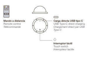 The luminaire incorporates an LED module with a battery rechargeable via an inductive charging system, along with a control that allows selection of three light intensity levels.