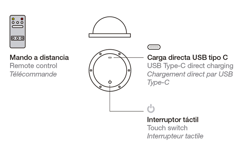 La luminaria incorpora un módulo LED con batería recargable mediante sistema de inducción, junto con un mando regulador que permite seleccionar entre tres niveles de intensidad luminosa.
