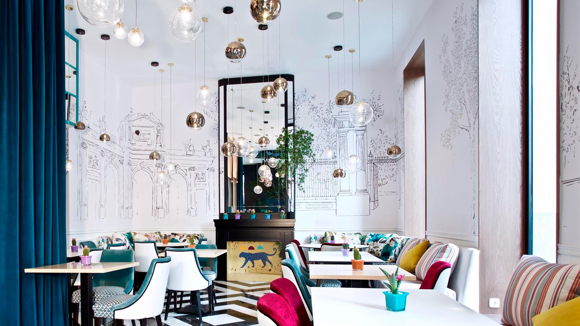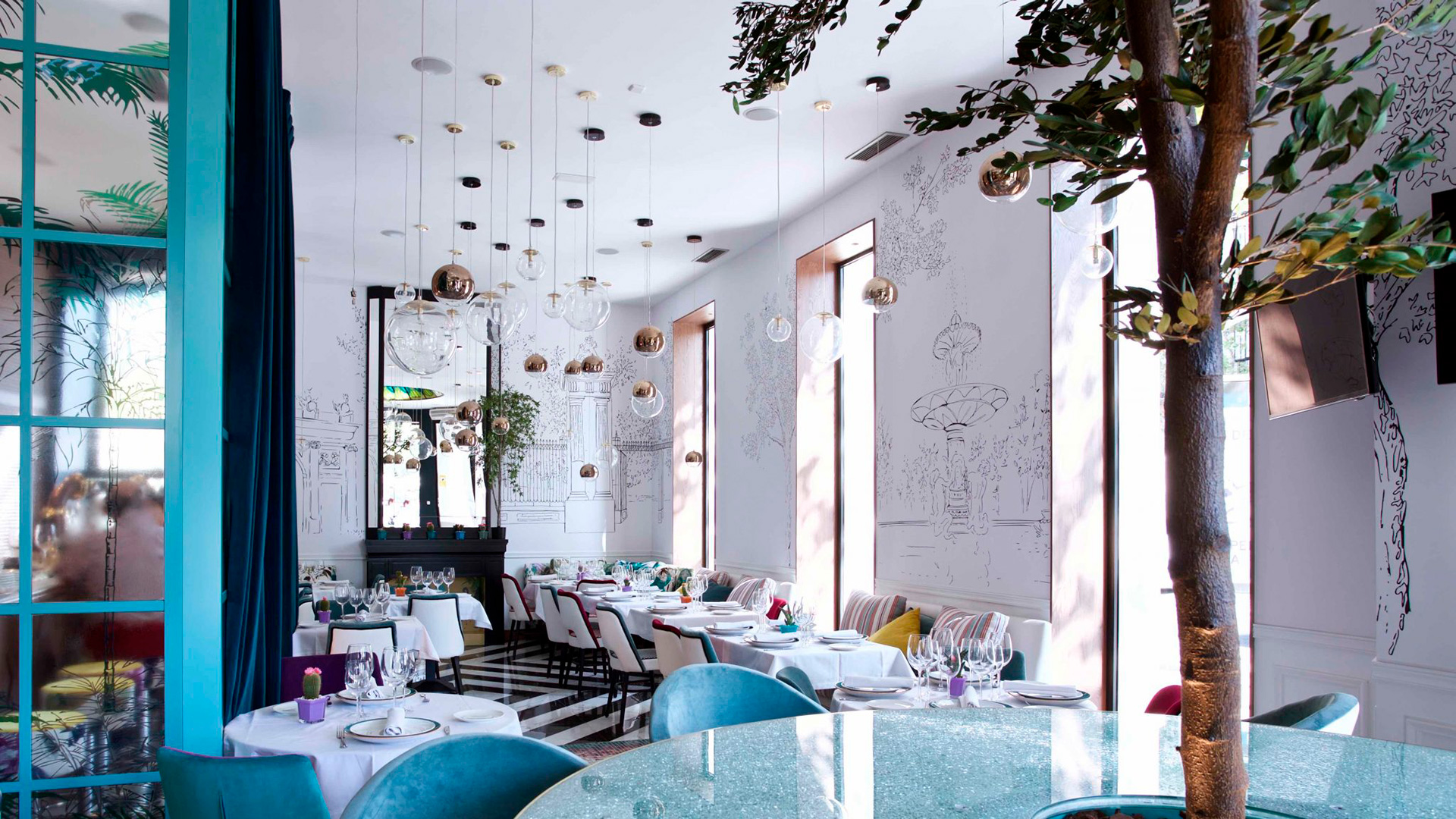 Project realized for the restaurant Puerta de Alcalá, a restaurant which represents the joyful spirit of Madrid center. The interior design was made by Olga López de Vera creating a colorful warm atmosphere. For the lighting solutions, we produced a series of transparent crystal globes with different diameters, integrating golden details and ceiling supports in different finishes too.