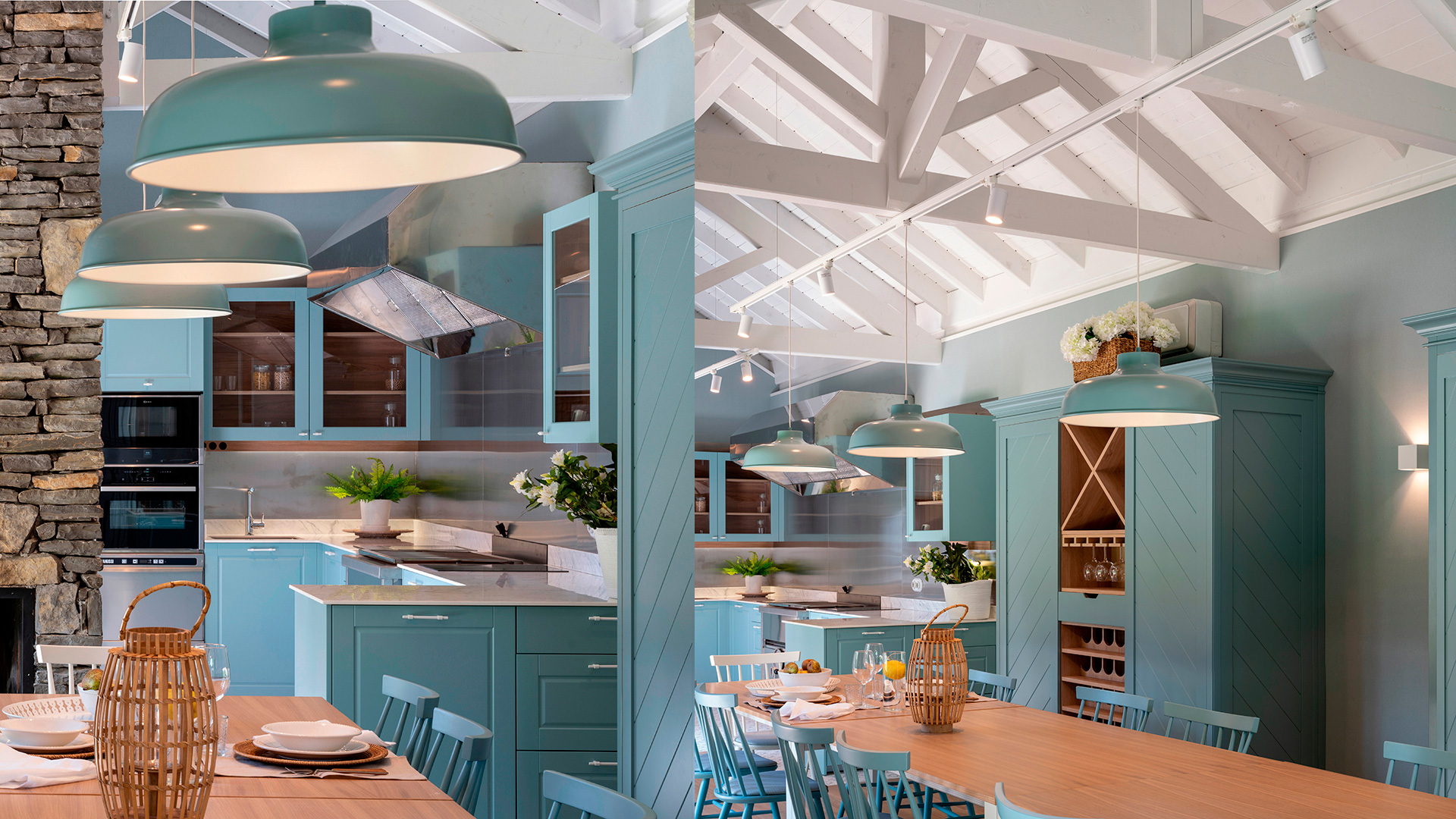 Lighting project with our Madison lamps from our catalogue, lacquered in the special finish chosen by the interior designer. The intention was to optimize the light in the space for family gatherings and it was achieved thanks to large windows and by choosing a blue tone that fits with the environment, giving it a very modern and cheerful note.