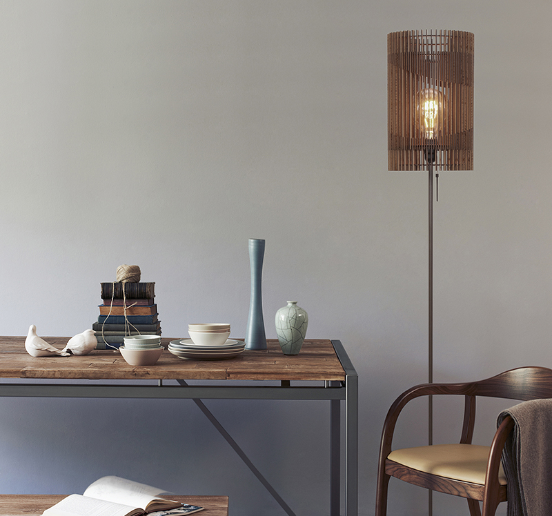 The parallel and concentric wood slats were designed as a light diffuser. Thanks to their different sizes, they draw elegant organic curves in their environment.