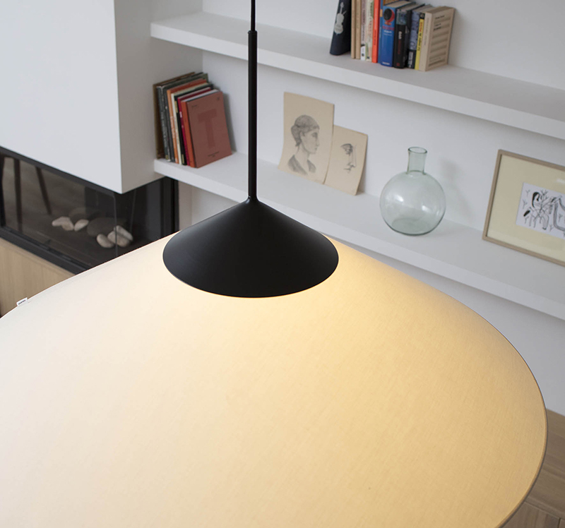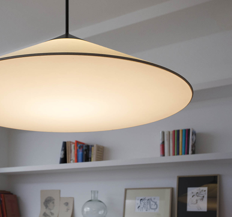 In its different versions, hanging lamp, wall lamp and ceiling lamp, the continuous plane of its diffuser is slightly perceived and the direct light projected is uniform, without any striden- cy. The shadows resulting from this are soft. In contrast, the ambient light emitted by the shade generates a serene, friendly and relaxed atmos- phere that warms the entire environment.