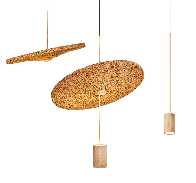 Estructura en corcho acústico, madera de haya y latón satinado.
