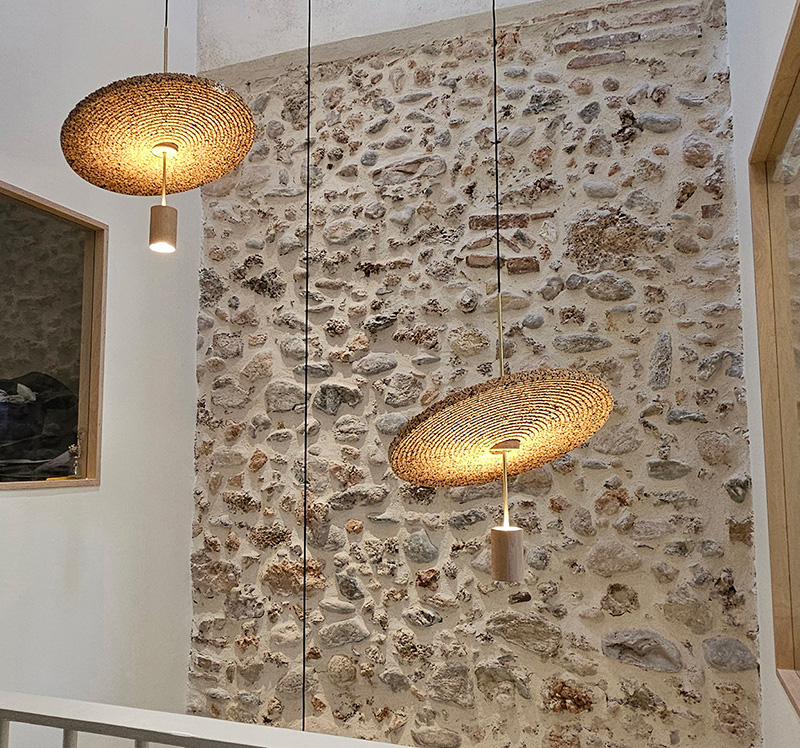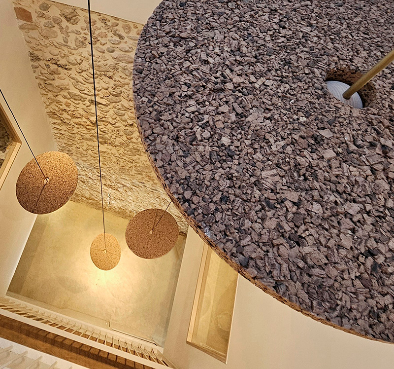 Producida con una combinación de materiales sostenibles de origen local, Calma aporta lo mejor de la tecnología y la naturaleza. Las elegantes tablas flotantes se esculpen en un proceso de cero residuos, ya que los desechos se transforman de nuevo en corcho. Los tableros de corcho son ajustables, creando un interesante juego de luces y sombras en las olas del material. Esta textura también mejora la absorción del ruido, contribuyendo a crear un ambiente sofisticado y relajante.