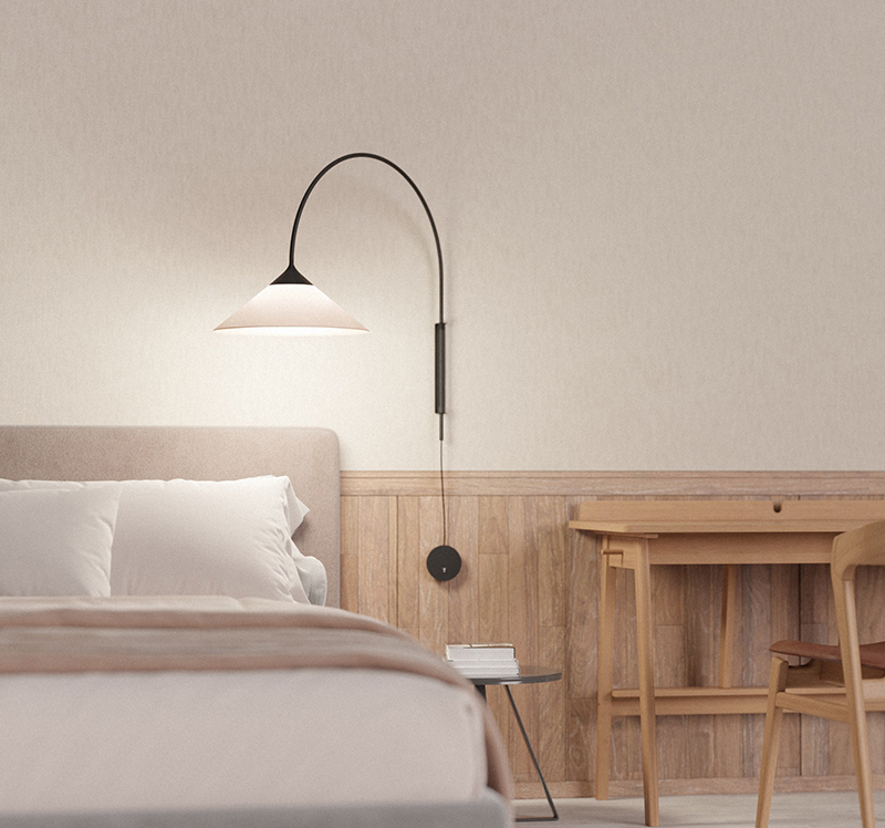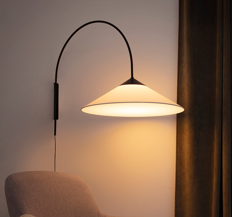 In its different versions, hanging lamp, wall lamp and ceiling lamp, the continuous plane of its diffuser is slightly perceived and the direct light projected is uniform, without any stridency. The shadows resulting from this are soft. In contrast, the ambient light emitted by the shade generates a serene, friendly and relaxed atmosphere that warms the entire environment.