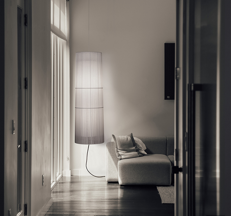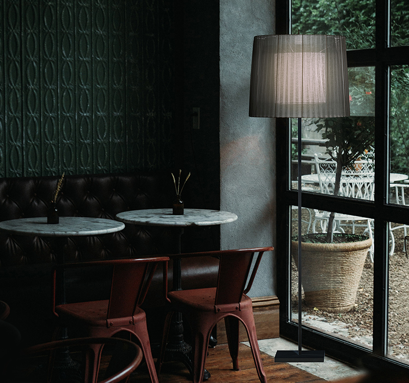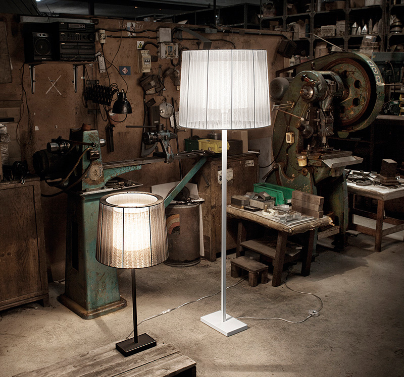 El diseño de la colección Indiana destaca por sus pantallas en organza. La transparencia de la tela se silencia con un difusor interno en forma de pantalla cónica. Las superposiciones dan volumen a la pantalla.