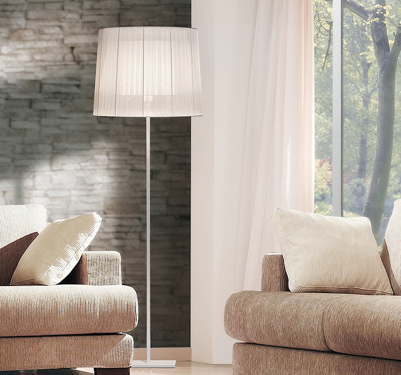 En la versión con pantalla de organza, pantalla difusora interior en forma cilíndrica de poliéster.