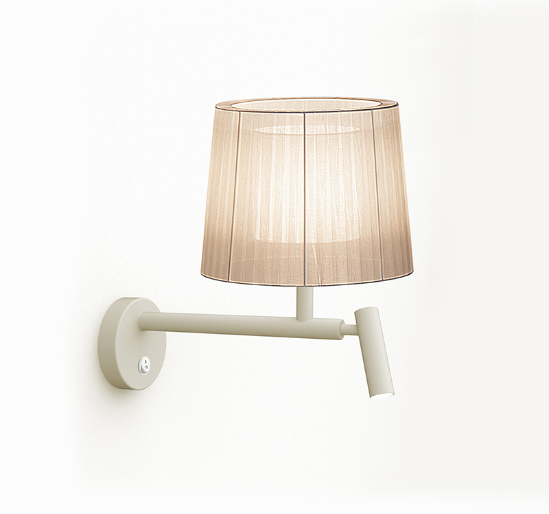 El diseño de la colección Indiana destaca por sus pantallas en organza. La transparencia de la tela se silencia con un difusor interno en forma de pantalla cónica. Las superposiciones dan volumen a la pantalla.