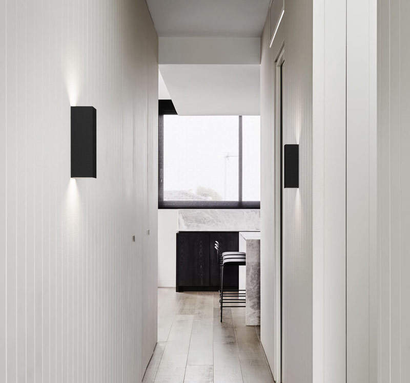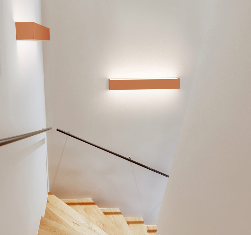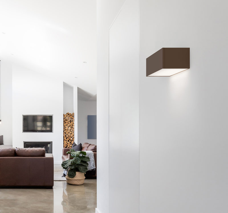 El aplique Line se fabrica en diferentes acabados: blanco, negro, níquel y óxido y todas sus variantes tienen luz superior e inferior. Se trata de una pieza muy versátil y apropiada tanto para uso doméstico como para proyectos contract.